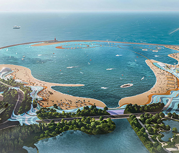 該項(xiàng)目位于月亮灣旅游度假區(qū)海堤外側(cè),以海濱文體旅游綜合體為定位,以2012年四條鯨魚擱淺新灘鹽場(chǎng)附近事件為引,結(jié)合古黃河文化和海洋文化,構(gòu)建以“鯨魚沙灘”為主題的IP。